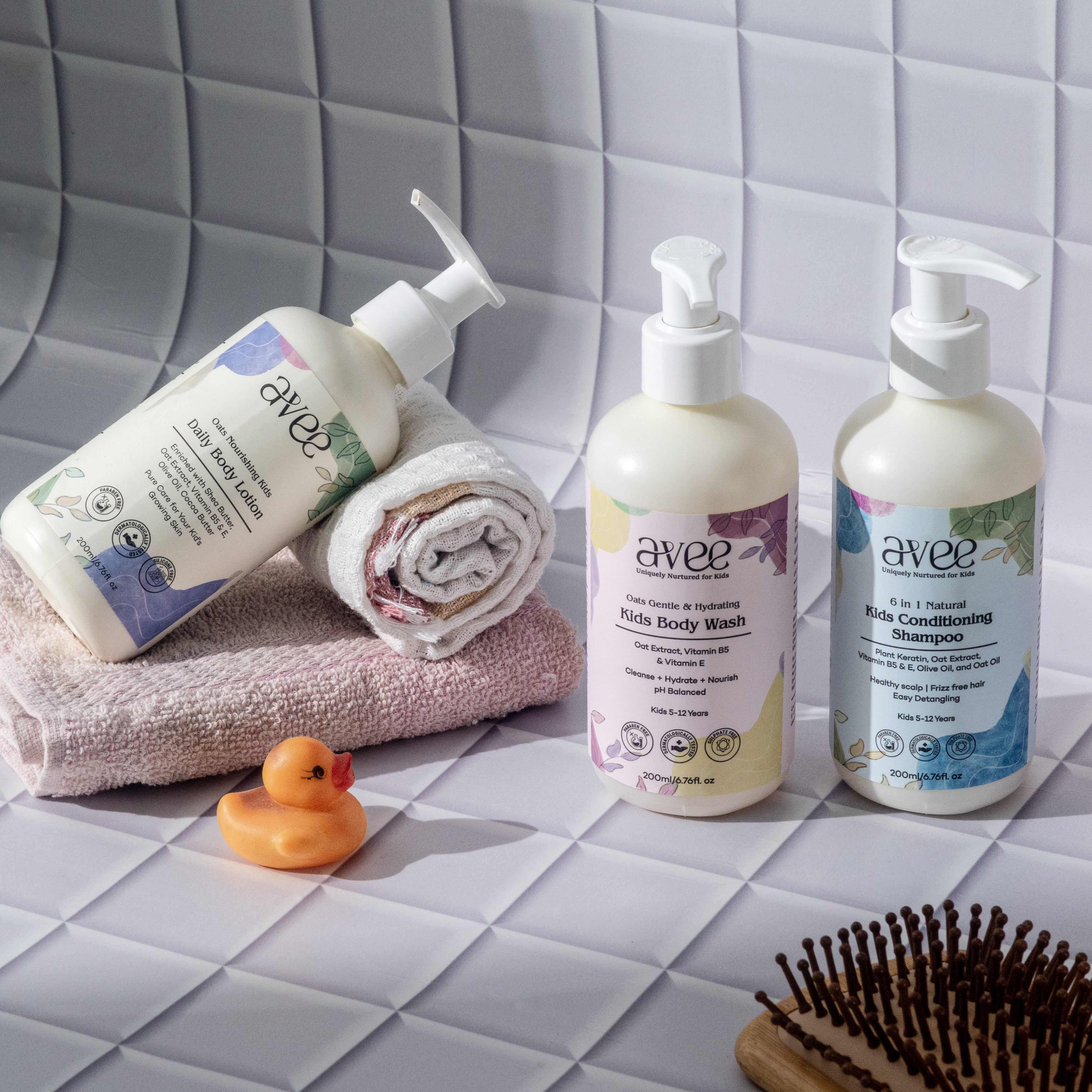 - All the AVEE products are DERATOLOGIST-CERTIFIED and enriched with Oat Extract, Vitamin B5 & E, Olive Oil, and Oat oil, ensuring safety and effectiveness for kids' daily grooming needs.